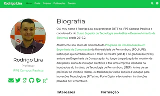 Assim como o site da Profª Natalia, eu estou usando o gerador estático Hugo e o Academic. No Academic, eu escolhi o tema forest (branco/verde) pois é mais parecido com o padrão de cores utilizado pelo IFPE.