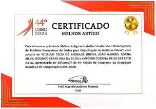No dia 25/07/2024, em Brasília, o artigo “Avaliando o Desempenho de Modelos Generativos de Dados para Classificação de Notícias Falsas” conquistou a premiação de Melhor Trabalho de Graduação do Encontro Nacional de Computação dos Institutos Federais (ENCompIF), evento realizado no 44º Congresso da Sociedade Brasileira de Computação!